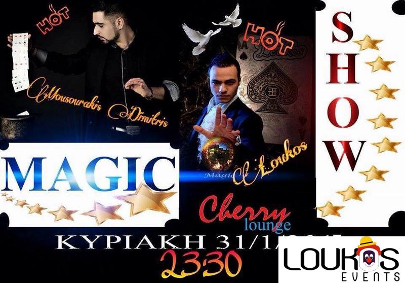 Αυτή την Κυριακή σας περιμένουμε σε μια Βραδιά Μαγείας στο Cherry Lounge Cafe. Ο Μάγος Loukos και ο Μάγος Δημήτρης Μουσουράκης "Demar" θα είναι εκεί να σας ταξιδέψουν στον κόσμο των ψευδαισθήσεων.